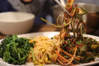 김치로 제공되는 종류는 얼갈이 나물, 콩나물무침, 겉절이 3가지 제공됩니다.