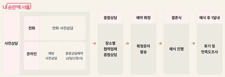 공공예식장 신청 안내 ○ 신청 자격 : 서울 생활권자 (서울 소재 직장인, 대학생, 자영업자 포함) ○ 신청 방법 : 상담사와 사전상담 (유선 1899-2154 또는 사이트 내 후 예식공간 별 결혼전문업체와 종합상담을 통해 계약 |