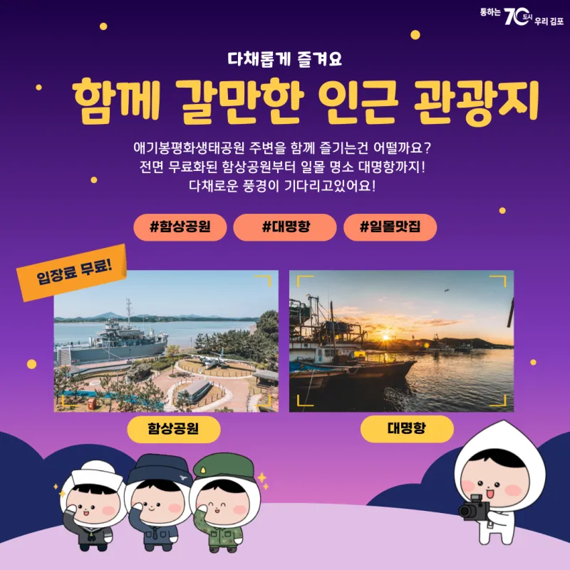 김포 바다의 정취를 만끽하고, 근처 애기봉평화생태공원, 함상공원과 함께 하루 코스로 즐겨보세요!