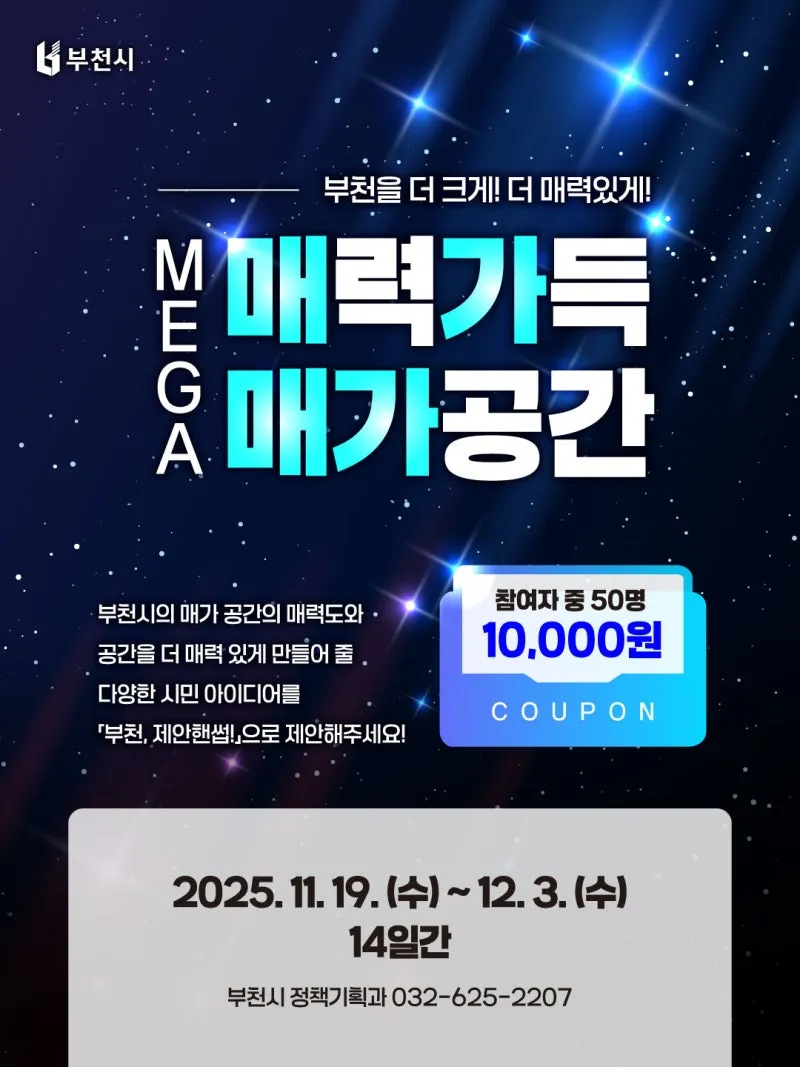 부천을 더 매력 있게! 매가(MEGA) 공간 정책제안 참여하고 1만원 쿠폰 받자!
