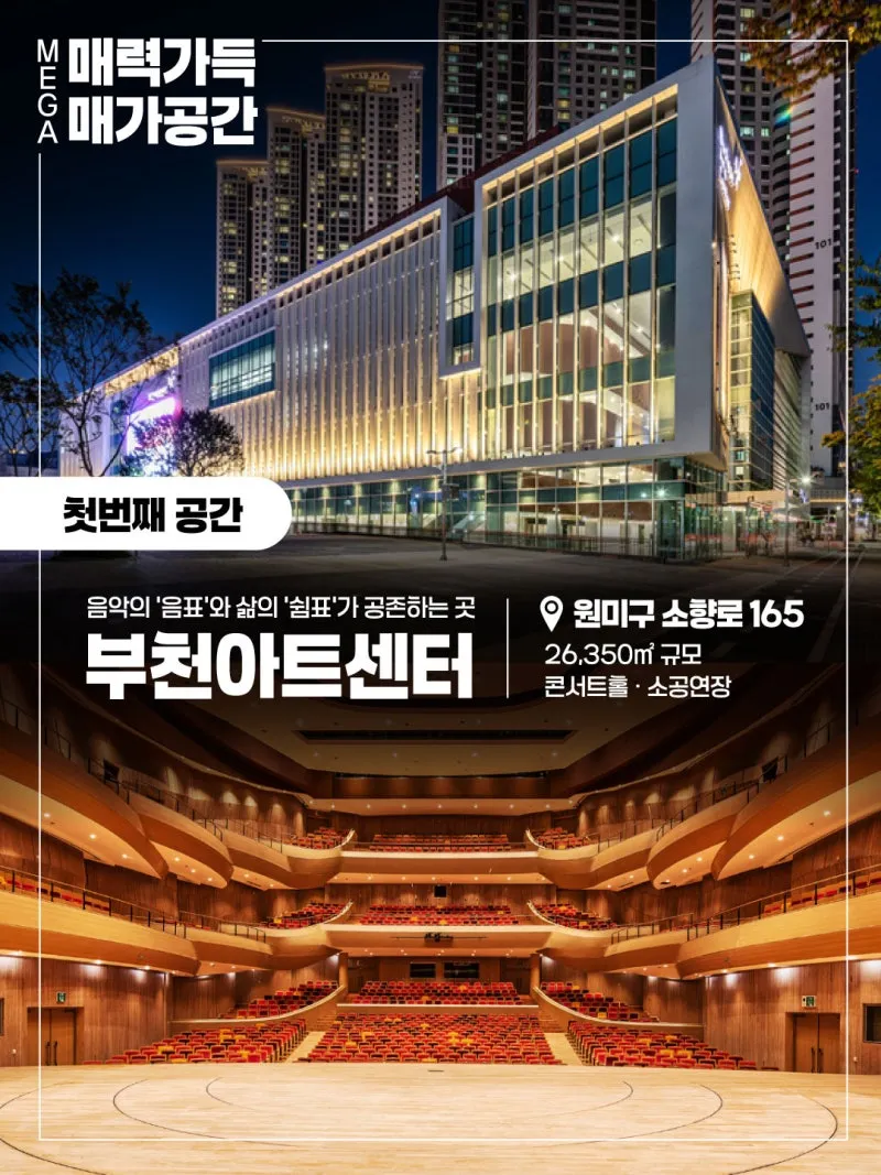 음악의 ‘음표’와 삶의 ‘쉼표’가 공존하는 부천 대표 문화공간 ????위치 : 원미구 소향로 165 ✔️규모 : 26,350㎡ ✔️시설 : 콘서트홀 · 소공연장 |