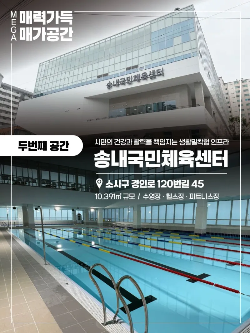 시민의 건강과 활력을 책임지는 생활밀착형 인프라! ????위치 : 소사구 경인로120번길 45 ✔️규모 : 10,391㎡ ✔️시설 : 수영장 · 헬스장 · 피트니스장 |