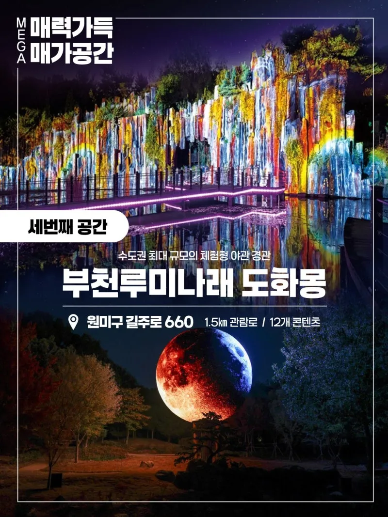 수도권 최대 규모의 체험형 야관 경관! 밤의 부천을 화려하게 밝혀주는 대표 야경 명소 ????위치 : 원미구 길주로 660 ✔️관람로 : 1.5km ✔️콘텐츠 : 12개 |