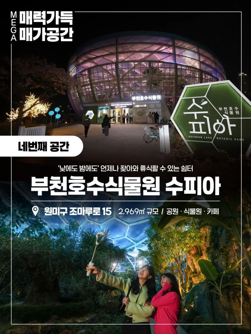 낮에도, 밤에도 언제나 힐링이 가능한 부천 시민들의 쉼터 공간! ????위치 : 원미구 조마루로 15 ✔️규모 : 2,969㎡ ✔️구성 : 공원 · 식물원 · 카페 |