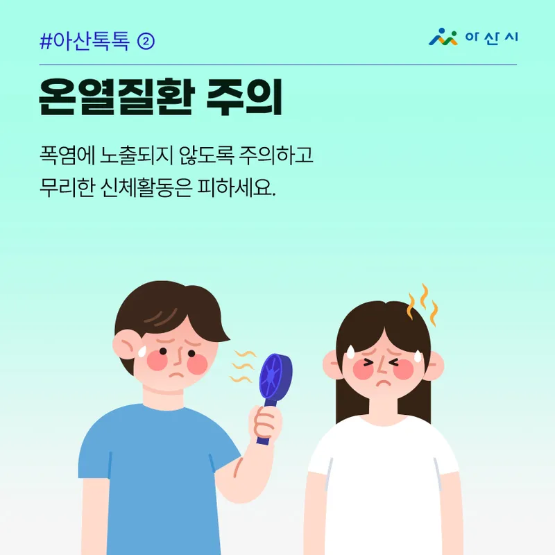 폭염에 노출되지 않도록 주의하고 무리한 신체활동은 피하세요.