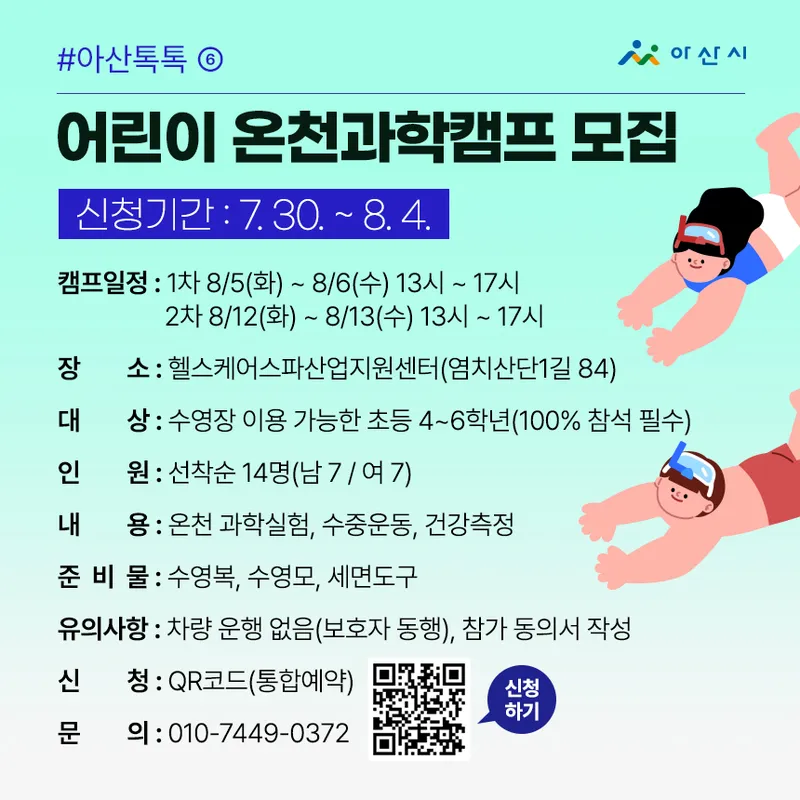 prev next 공지사항 어린이 온천과학캠프 모집 [2025 시민건강 스파·헬스케어] 어린이 온천과학캠프 ·장 소: 헬스케어스파산업진흥원(염치산단1길 84) ·일 정: 1차 8월 5일(화)~ 6일(수) 13시 ~ 17시 &nb 2025-07-25 2025년 수중운동 시범운영 프로그램 2025-07-04 2025년 수중운동 프로그램 준비중 2025-05-07 직장인 수중운동 온천건강아카데미 일정안내 2024-10-28 프로그램 안내 자주하는 질문 FAQ