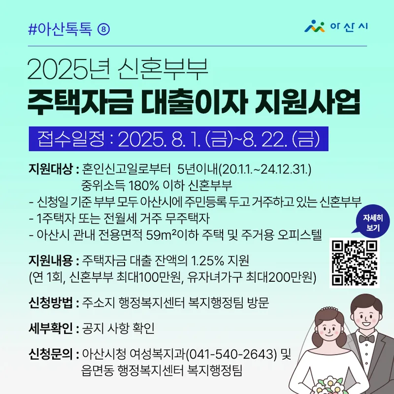 2025년 신혼부부 주택자금 대출이자 지원 사업 신청 안내 ▣ 신청기간 : 2025. 8. 1. ( 금 ) ~ 8. 22.( 금 ) ▣ 지원대상 : 기준일 (25.1.1) 기준 혼인신고일로부터 5 년 (2020.1.1.~2024.12.31.) 이내 중위소득 180% 이하 신혼부부 - 신청일 기준 부부 모두 아산시에 주민등록 두고 거주하고 있는 신혼부부 - 1 주택자 또는 전월세 거주 무주택자 ( 예 ) ① 1 주택자 : 부부 중 1 인 소유의 주택에 거주 ② 전월세 거주 무주택자 : 부부 모두 무주택이며 전월세로 거주하는 주택 ...