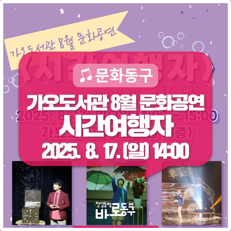 {"title":"2025년 8월 가오도서관 문화공연 <시간여행자> 안내","source":"https://blog.naver.com/djdonggu/223959950348","blogName":"대전광역시..","domainIdOrBlogId":"djdonggu","nicknameOrBlogId":"대전 동구청","logNo":223959950348,"smartEditorVersion":4,"blogDisplay":true,"meDisplay":true,"cafeDisplay":true,"lineDisplay":true,"outsideDisplay":true}