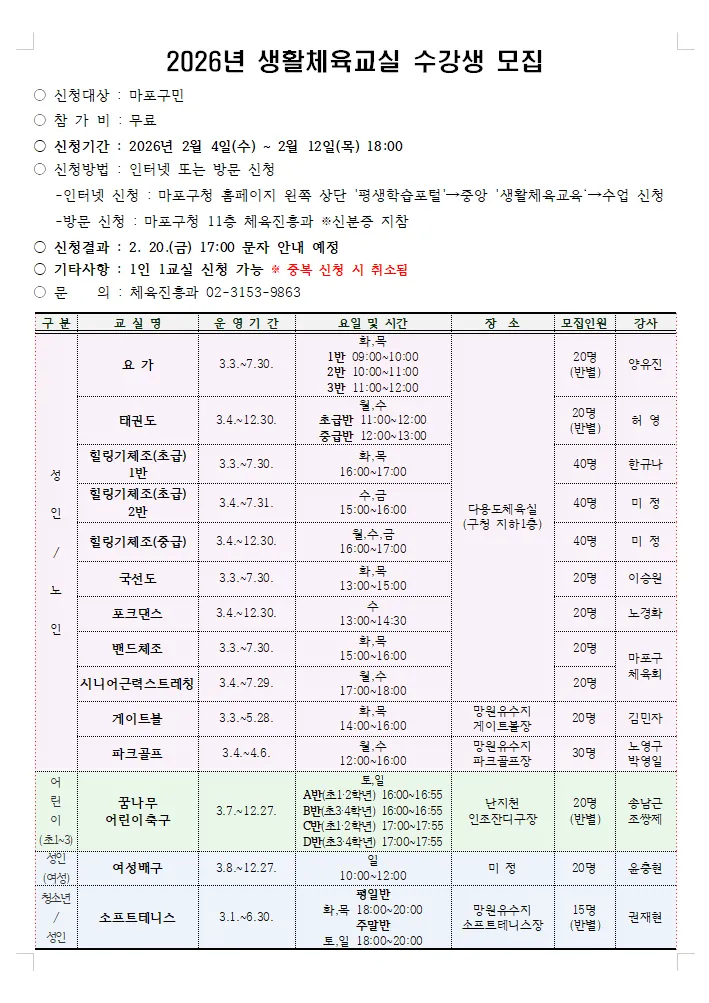 마포와 함께하는 생활체육교실로 초대합니다💌