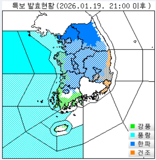 1월 19일(월) 21시 서울 한파주의보 발효