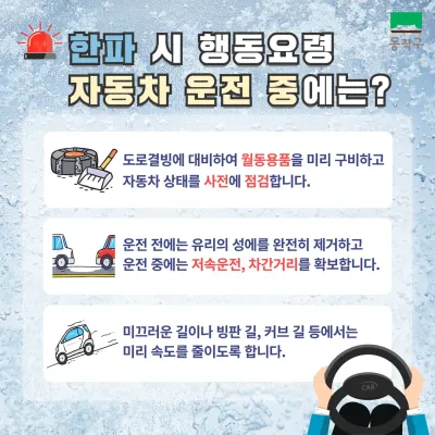 운전 전에는 앞 유리의 성에를 완전히 제거, 운전 중에는 평소보다 저속 운전하고 차간거리를 확보하여 사고 예방