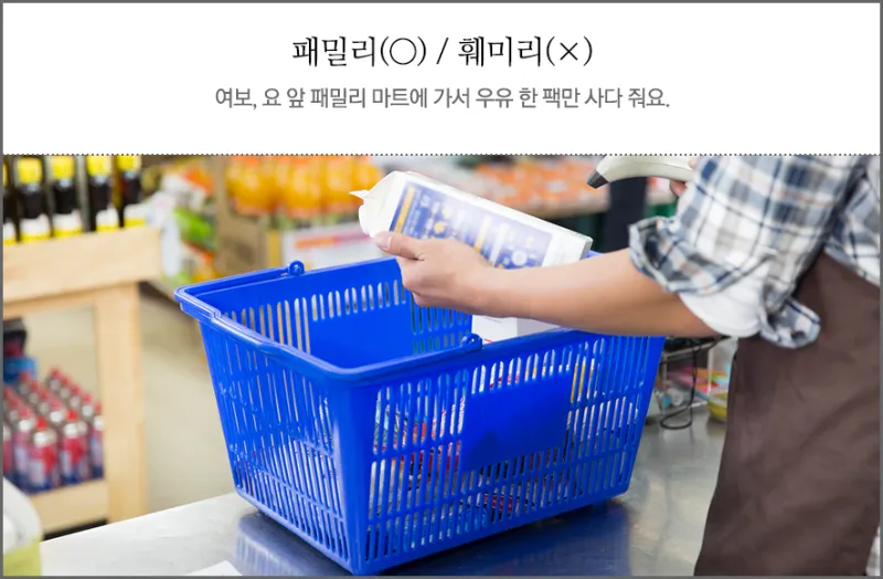여보, 요 앞 패밀리 마트에 가서 우유 한 팩만 사다 줘요.