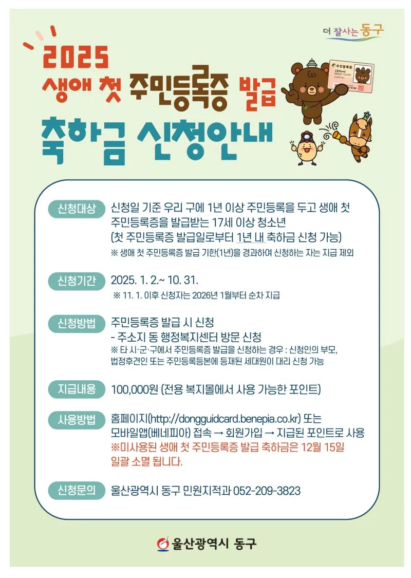 울산 동구, 2025 생애 첫 주민등록증 발급 축하금 신청 안내