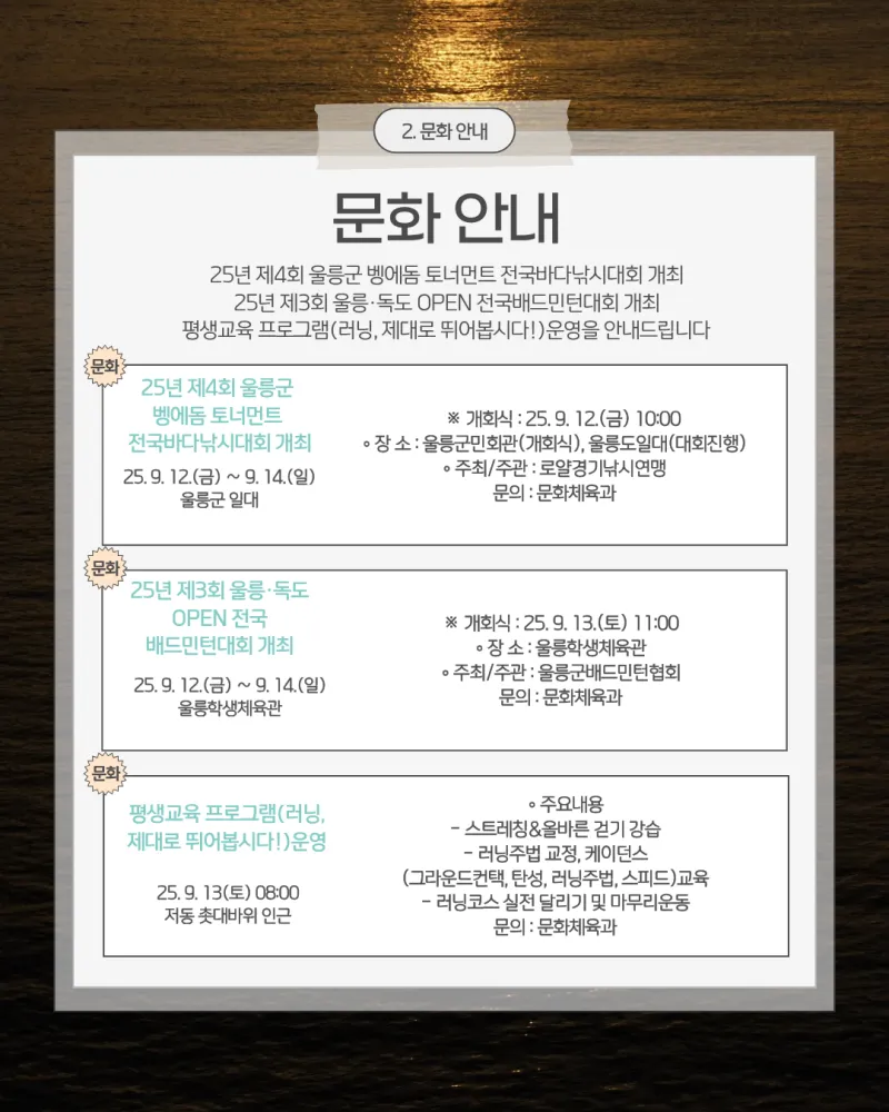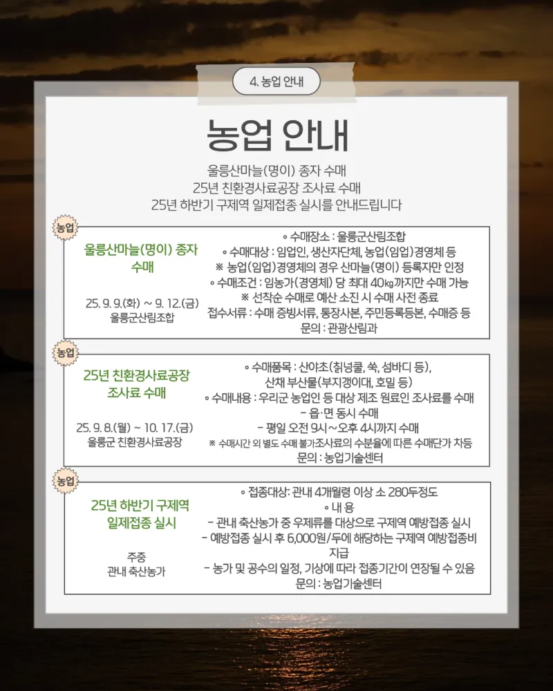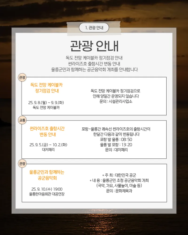 ※ 25. 9. 8.(월) 10:00 울릉읍 / 9. 9.(화) 10:30 북면 /