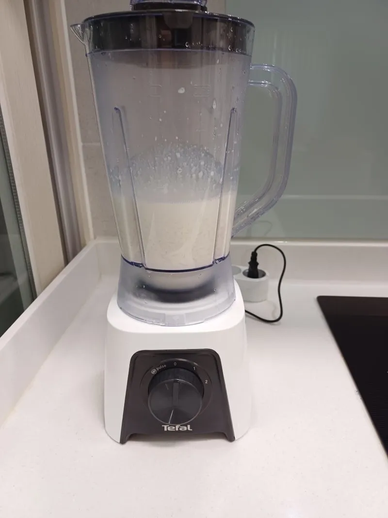 밥과 우유 혼합물을 식힌 후 믹서기에 넣어 곱게 갈아줍니다.