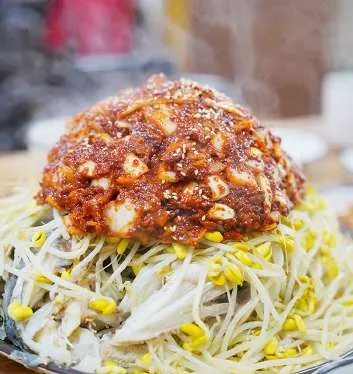 콩나물과 빨간 양념이 수북하게 쌓여있는 독특한 모습의 대구뽈찜은 막걸리와도 잘 어울리고, 감자면 사리를 추가해서 먹으면 완벽합니다.