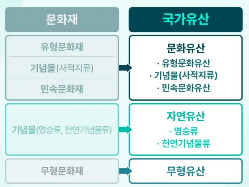 유네스코 국제 기준과 부합하게 문화유산·자연유산·무형유산으로 분류하고, 통칭 국가유산 용어를 채택했습니다.