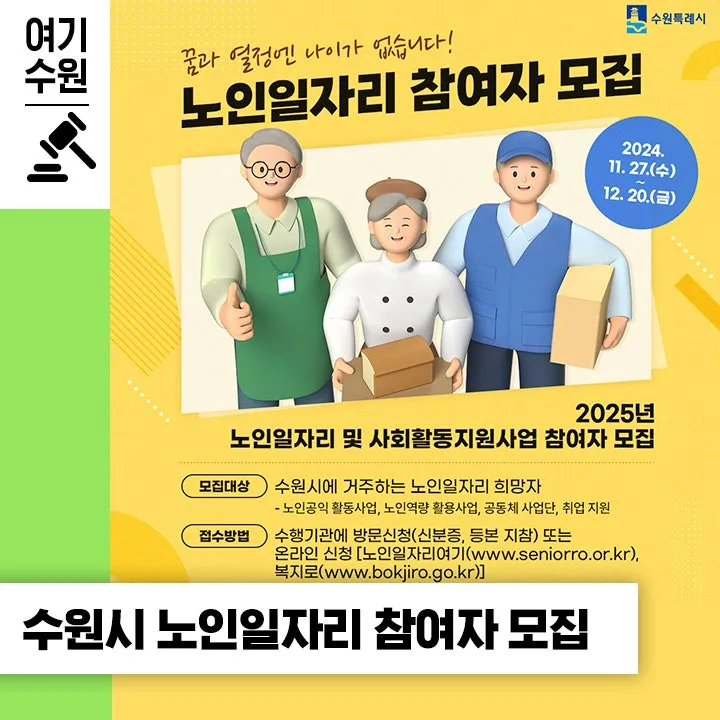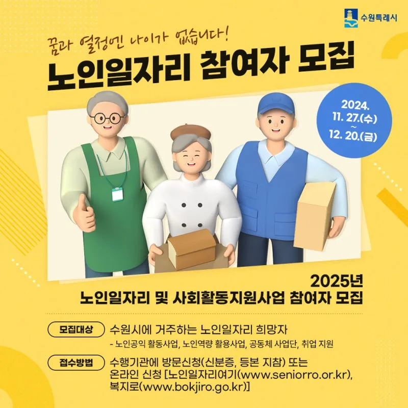 꿈과 열정엔 나이가 없습니다! 수원시 노인일자리 및 사회활동지원사업 참여자 모집 안내