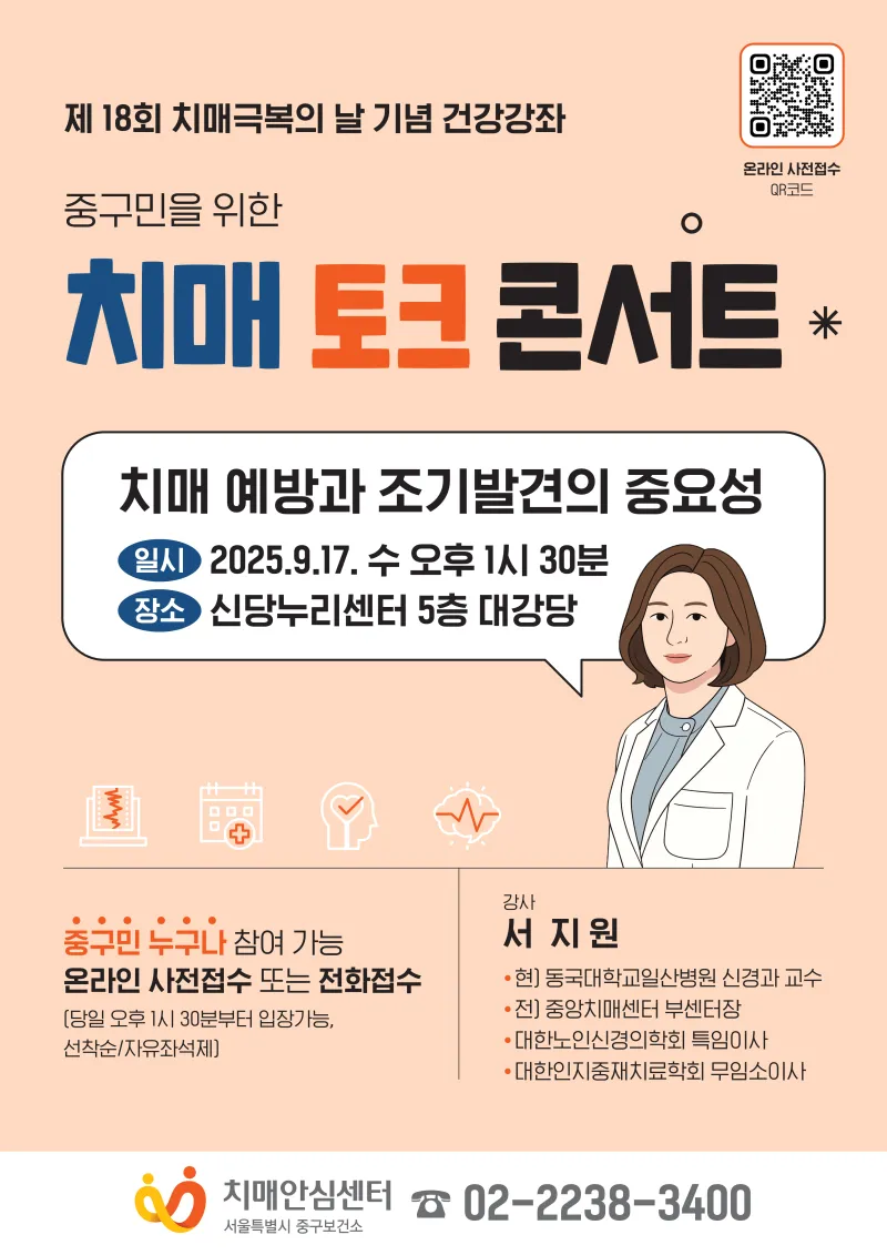 제 18회 치매극복의 날을 맞이하여 '치매완전정복 중구민을 위한 치매 토크 콘서트'를 진행합니다. 일시: 2025년 9월 17일 (수) 오후 1:30 ~ 3:30 장소: 신당누리센터 5층 대강당 (서울 중구 다산로33길 3) 동국대학교 일산병원 신경과 서지원 교수님을 모시고 치매 예방과 극복을 위한 소중한 시간을 나누고자 합니다. 참여를 원하시는 분께서는 아래 내용을 작성 부탁드립니다. * 중구민 대상, 9월 17일(수) 12~17시 신당누리센터에서 앱 내 이벤트 참여 버튼 클릭 시 중구건강마일리지 500P 지급 * 본 설문을 통해...