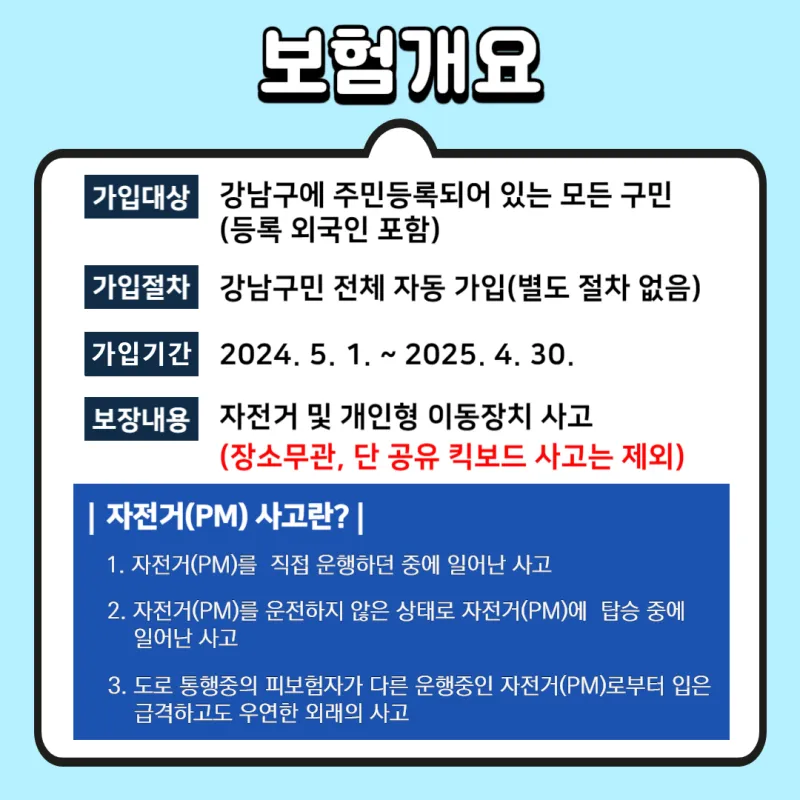 강남 구민이라면? 자전거/개인형 이동장치(PM) 보험 자동 가입!