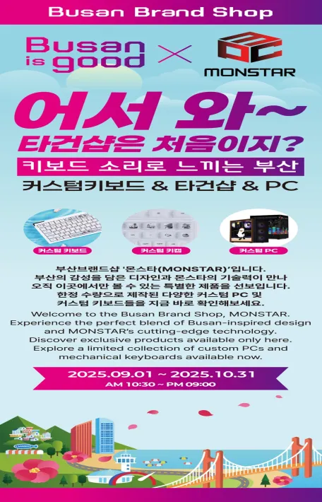 이번 반짝 매장(팝업 스토어)은 맞춤형(커스텀) 키보드 및 고급(하이엔드) 피시(PC) 전문 기업 '몬스타 주식회사'와 협업을 통해 체험형 '타건 숍'으로 구현해 생활 속에서 부산의 도시브랜드를 친근하게 경험할 수 있도록 기획됐습니다.