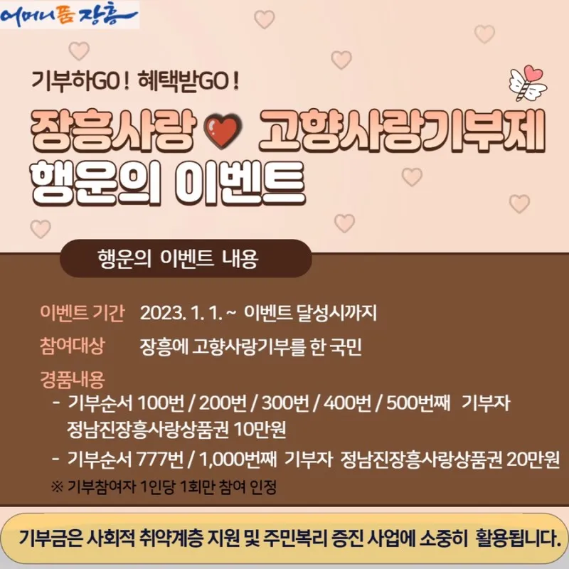 장흥사랑 ❤️ 고향사랑기부제 행운의 이벤트를 진행합니다. 군민과 향우 여러분의 많은 관심과 참여 부탁드립니다.