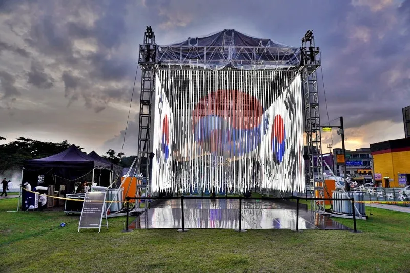 레이저 조명 아트를 통해 광복의 영광이 알록달록 화려한 색깔로 빛납니다.