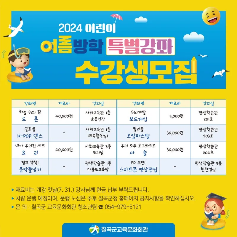 #칠곡군교육문화회관 #칠곡군 #여름방학특별강좌 #초등여름방학 #칠곡군청 #청소년 #수강생모집 #2024여름방학