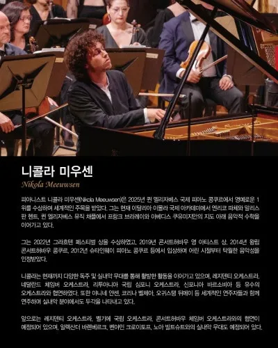 피아니스트 니콜라 미우센(Nikola Meeuwsen)은 2025년 퀸 엘리자베스 국제 피아노 콩쿠르에서 영예로운 1위를 수상하며 세계적인 주목을 받았다. 그는 현재 이탈리아 이몰라 국제 아카데미에서 엔리코 파체와 말리스 판 헨트, 퀸 엘리자베스 뮤직 채플에서 프랑크 브라레이와 아베디스 쿠유미지안의 지도 아래 음악적 수학을 이어가고 있다.
