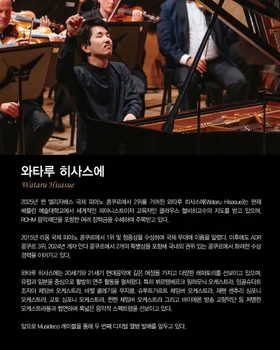 2025년 퀸 엘리자베스 국제 피아노 콩쿠르에서 2위를 거머쥔 와타루 히사스에(Wataru Hisasue)는 현재 베를린 예술대학교에서 세계적인 피아니스트이자 교육자인 클라우스 헬비히교수의 지도를 받고 있으며, ROHM 음악재단을 포함한 여러 장학금을 수혜하며 주목받고 있다.