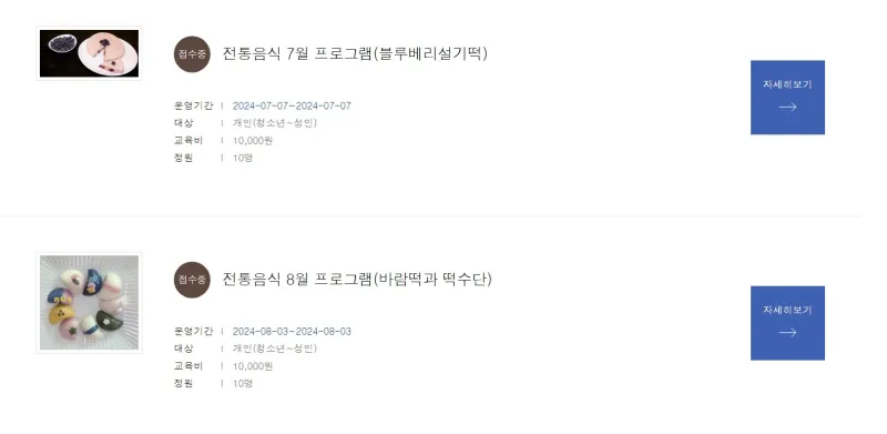 개피떡과 떡수단 만들기가 접수 중이고 교육비는 10,000원/ 정원은 10명입니다.