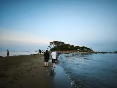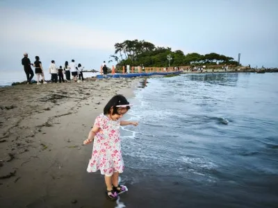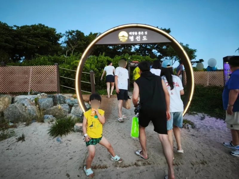 이번에 방문했을 때는 운 좋게 물길이 열려, 아이들과 함께 모래사장을 걸어 들어갔습니다.