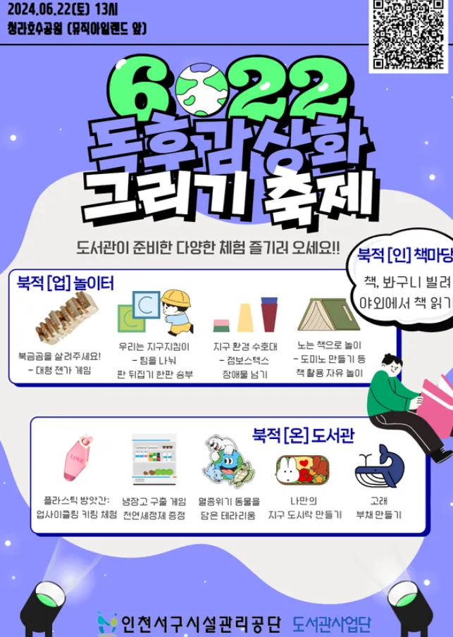 6월 20일 목요일날까지 접수를 받는 이번 독후감상화 그리기축제는, 6월 22일 토요일 오후 1시에 청라호수공원 플라워뮤직아일랜드에서 개최되는데요! 만4-5세의 아동을 대상으로 심사하는 유아부와, 1-3학년 초등학생들을 대상으로 심사하는 초등부로 나눠서 축제가 진행됩니다! 이외에도 환경체험부스, 작은운동회, 플리마켓과 같은 체험마당은 물론, 마술쇼, 난타공연, 댄스공연 등, 축제에서 빼놓을 수 없는 시간도 준비되었으니, 많은 관심과 참여 부탁드립니다!