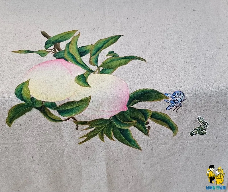 복숭아는 한 입 베어 물고 싶을 만큼 맛나 보입니다. 종이가 아닌 패브릭에 그린 그림이 이토록 선명하고 생동감 있게 표현할 수 있다는 게 경이롭습니다.