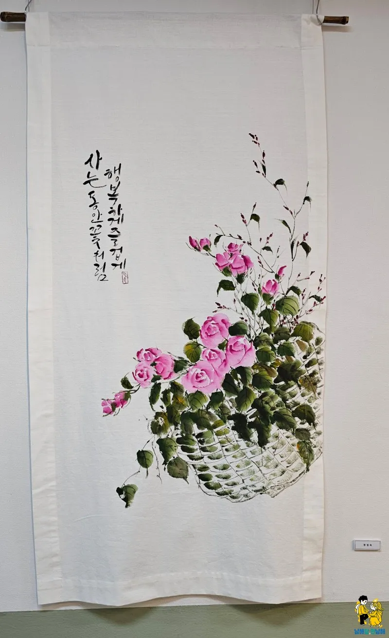 한정숙 님의 작품은 몇 번이고 다시 보기를 할 만큼 매력적입니다. 바구니 가득 담긴 화사한 장미꽃과 잎사귀 표현이 좋아서 그리고 "사는 동안 꽃처럼 행복하게 즐겁게"란 글귀가 더 여운이 남아 기자의 다락방 벽에 걸어두고 싶은 욕심이 났더랍니다.