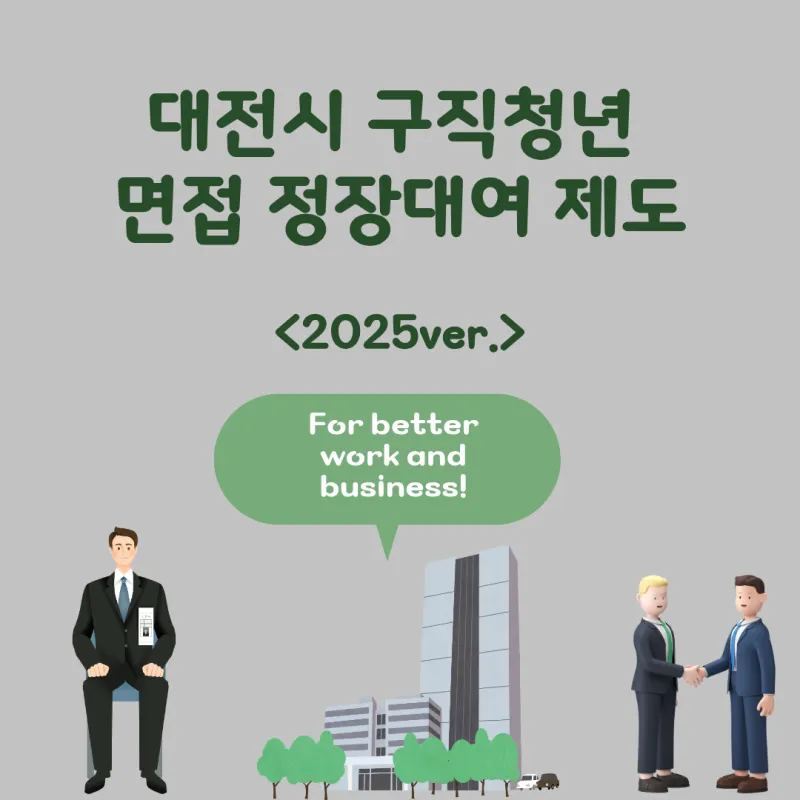 대전청년포털 사이트의 정책 안내 메뉴에 '구직청년 면접정장 대여' 사업이 소개되어 있으며, 2025년 공고는 대전시청 공식 홈페이지에서도 확인할 수 있습니다.