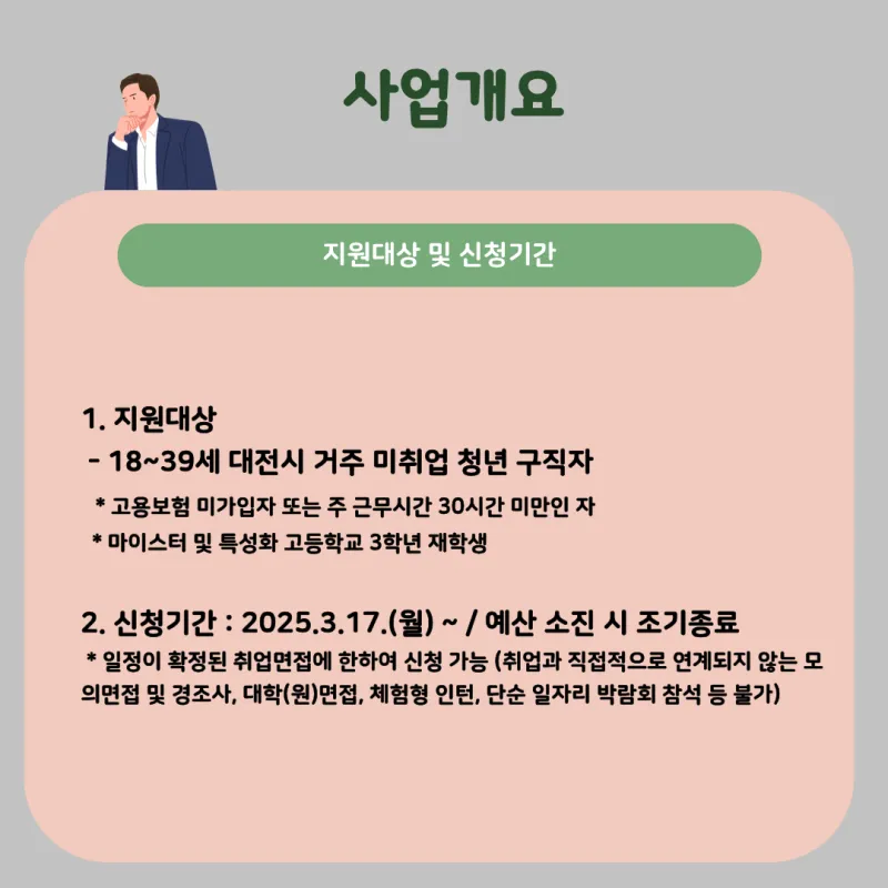 지원 대상은 18세부터 39세까지 대전시에 거주하는 미취업 청년 구직자입니다. 단, 고용보험에 가입된 자나 주당 근무시간이 30시간 이상인 사람은 제외 조건이 명시되어 있습니다. 일부 특성화고·마이스터고 3학년 재학생도 신청 대상에 포함됩니다.