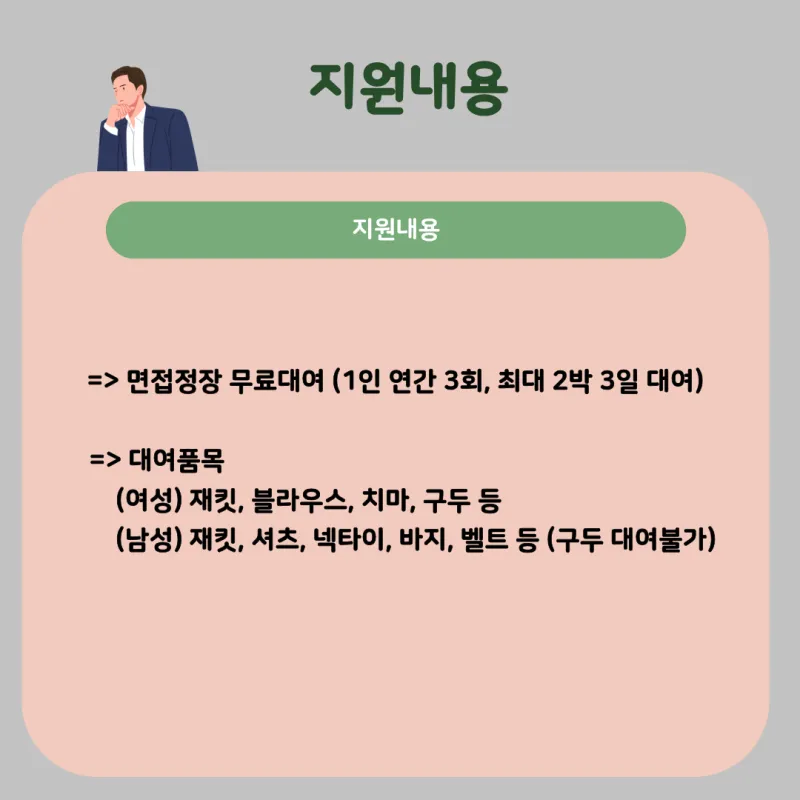지원 내용은 면접정장 무료 대여이며, 대여 횟수는 1인당 연간 최대 3회, 대여 기간은 2박 3일로 제한됩니다. 남성용 대여 품목은 재킷, 셔츠, 넥타이, 바지, 벨트 등이며 구두는 대여하지 않는 조건입니다. 여성용은 재킷, 블라우스, 치마, 구두 등을 포함하는 대여가 가능하다고 공고에 나와 있습니다.