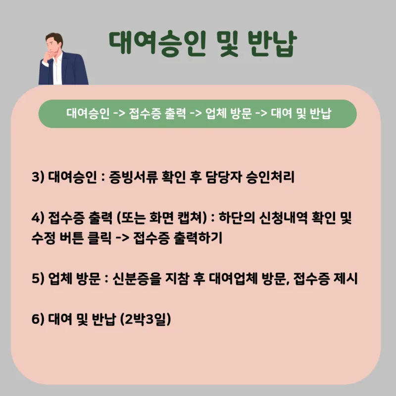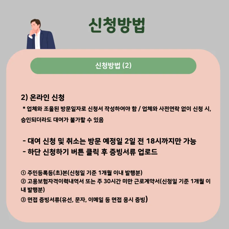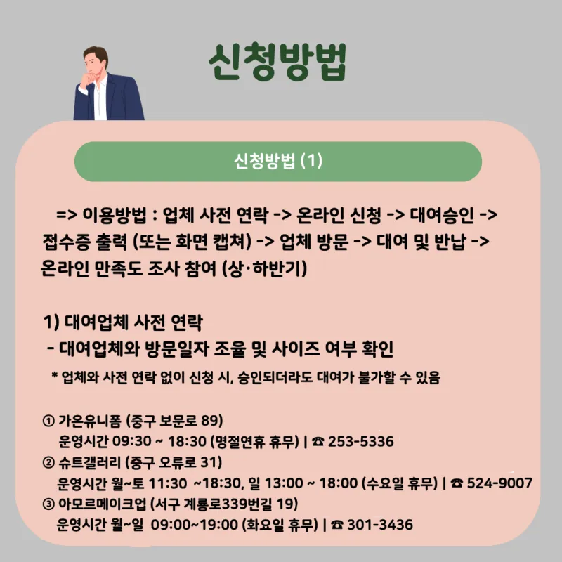 신청 절차는 다음과 같습니다. 먼저 대여업체와 사전 연락을 통해 방문 일정과 사이즈 조정을 한 뒤, 온라인 신청을 합니다. 이후 승인 절차를 거쳐 신청자는 접수증(출력 또는 화면 캡처)을 지참해 업체를 방문하여 정장을 대여하는 방식입니다. 대여가 끝난 후에는 온라인 만족도 조사를 해야 합니다.