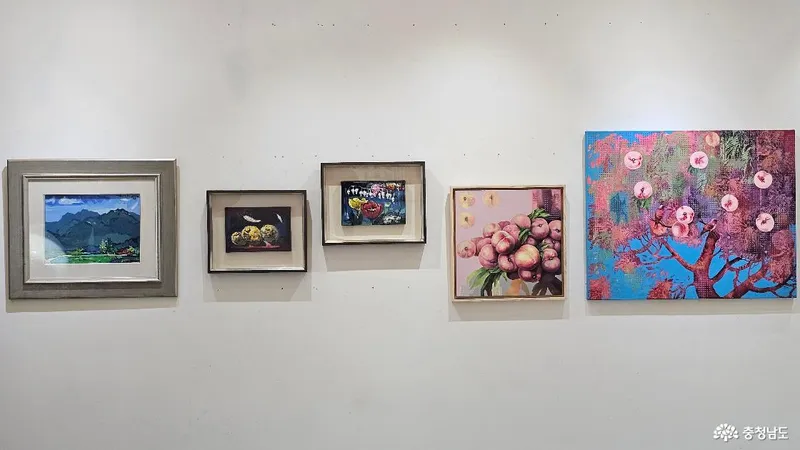 왼쪽 3 작품은 정영진 작가의 '계룡산 풍경' '모과' '향연'의 작품이, 오른쪽 2 작품은 박경희 작가의 '사랑스런 복숭아 25-1' '기억이 나무(red bird)작품이 전시되어 있습니다.