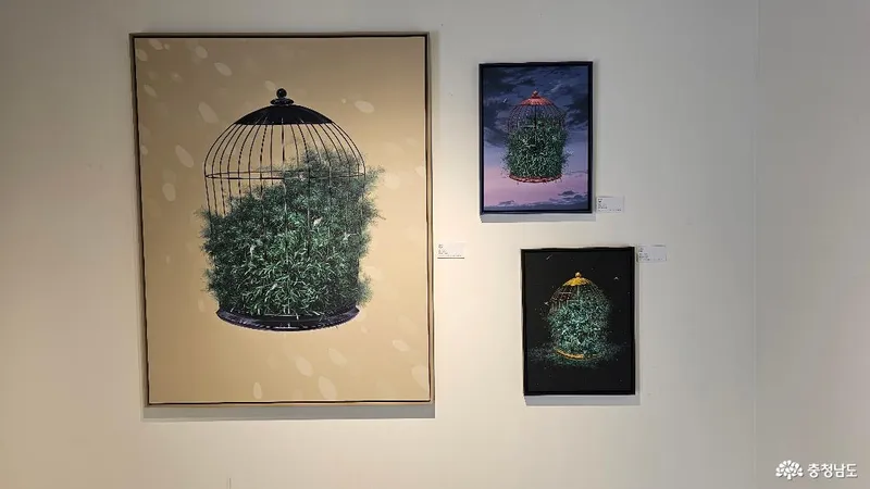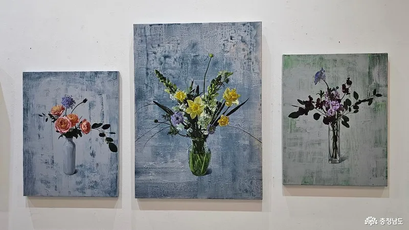 갤러리 쉬갈은 지하 1층에 있습니다. 왼쪽의 3 작품은 김경희작가의 작품으로 '빛나는 너 1. 2. 3.' 그리고 김연미 작가의 작품, 오른쪽에는 유병호 작가의 작품과 이은희 작가의 '공존의 풍경 1.2.3.'이 전시되어 있습니다.