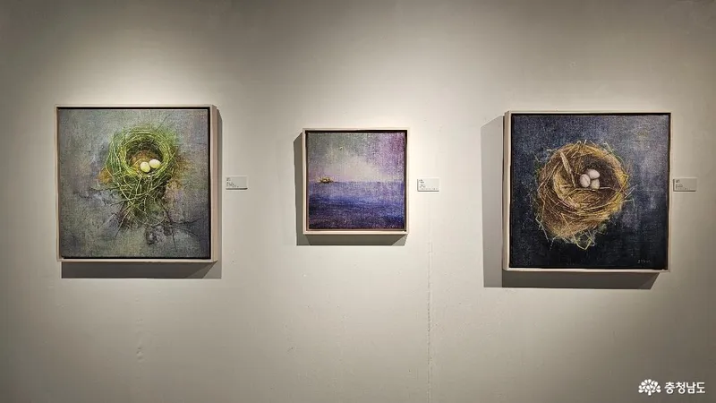 오경희 작가의 전시 작품으로 제목은 둥지, 떠나는 둥지, 둥지,입니다. 3작품 모두 린넨에 수채화 물감으로 그렸습니다.