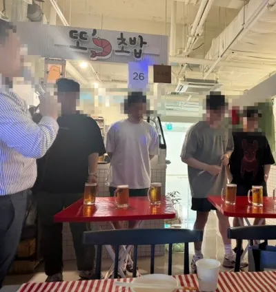 팀을 이뤄서 맥주 빨리 마시기 게임을 하였습니다.