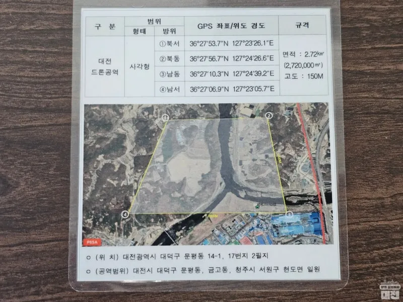 대전드론공원을 처음 이용해 보시는 분이라면 직원분이 친절하게 비행구역과 유의사항에 대하여 설명해 주십니다. 비행 허용 고도는 150m이며, 면적은 약 2.72㎢로 강 건너 청주시까지 매우 넓은 편입니다.