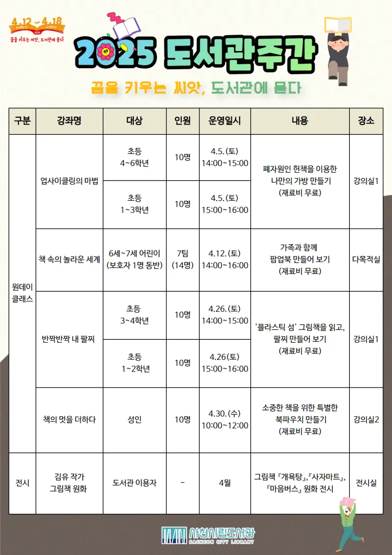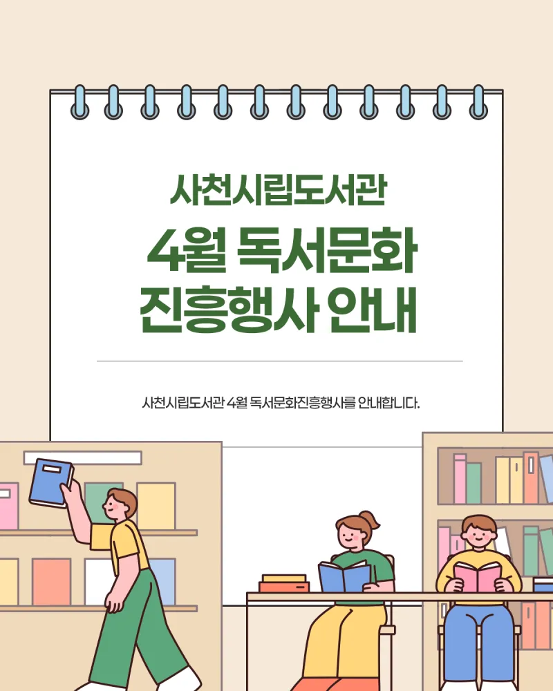 사천시립도서관 4월 독서문화진흥행사를 안내합니다.