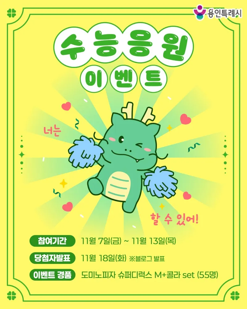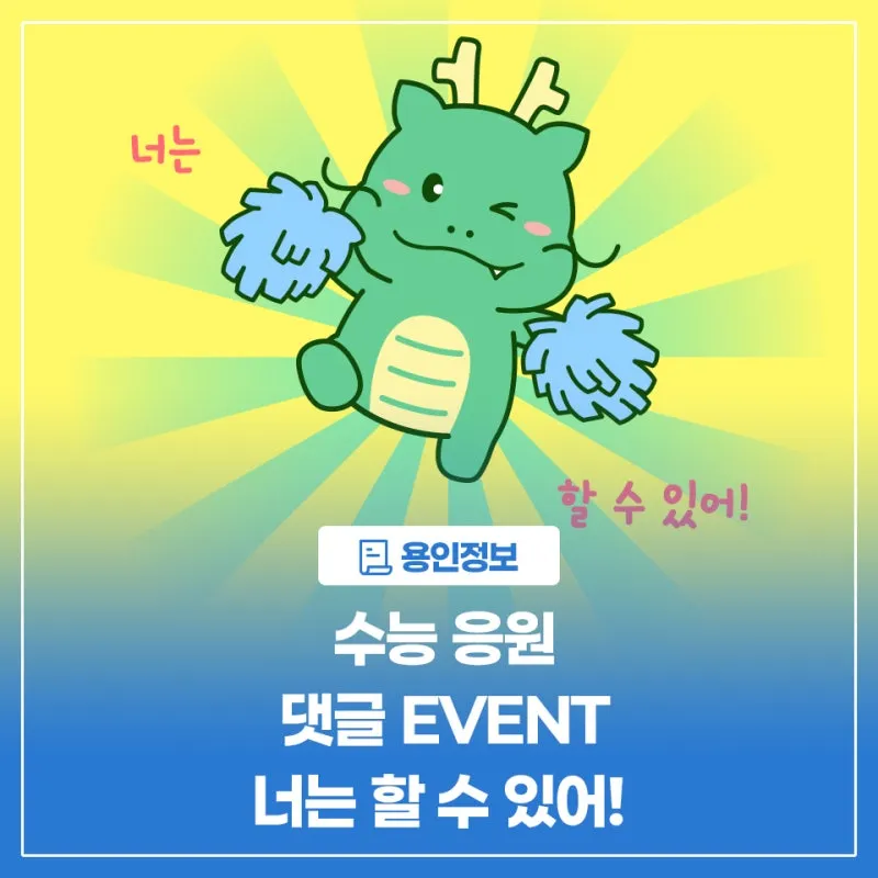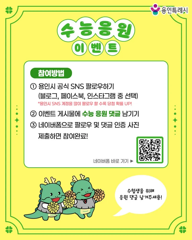 ① 용인시 공식 SNS 계정 팔로우하기 (블로그, 페이스북, 인스타그램 중 선택) *용인시 SNS 계정을 많이 팔로우 할 수록 당첨확률 UP! ② 이벤트 게시물에 수능 응원 댓글 남기기 ③ 네이버폼으로 팔로우 및 댓글 인증 사진 제출하면 참여완료! |