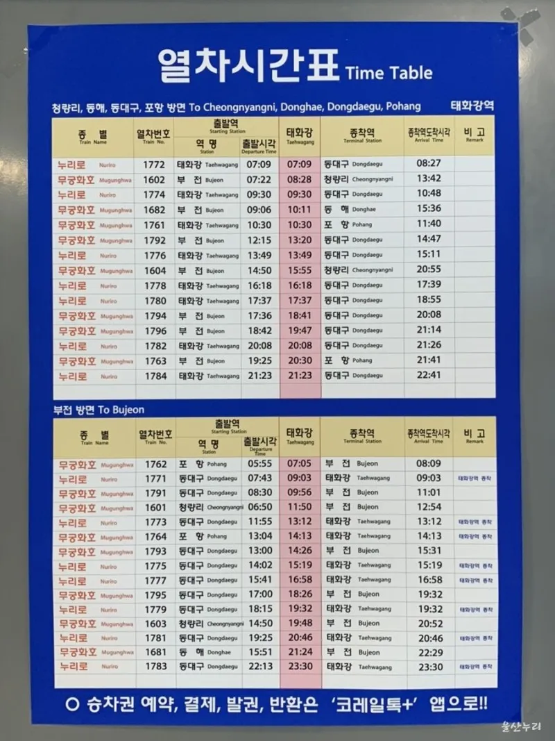 울산 태화강역 청량리/ 동해/ 동대구/ 포항 방면 열차 시간표