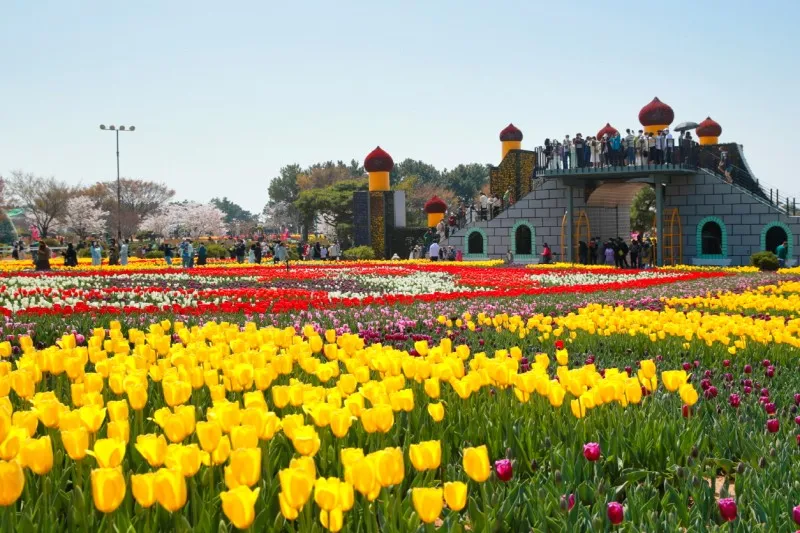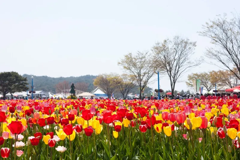 벚꽃이 저무는 동시에 시작되는 화려한 봄의 향연! 안면도 꽃지해수욕장이 보이는 드넓은 대지에 가득 피어난 화려한 색감의 튤립꽃이 물결처럼 아름답게 펼쳐지는 코리아플라워파크는 매년 봄이 찾아오면 태안 세계튤립꽃박람회가 열려 설레는 봄꽃 풍경을 선사합니다.
