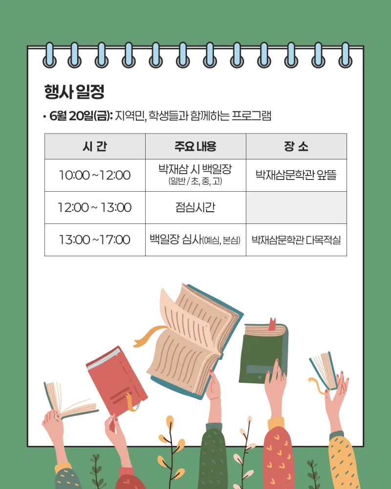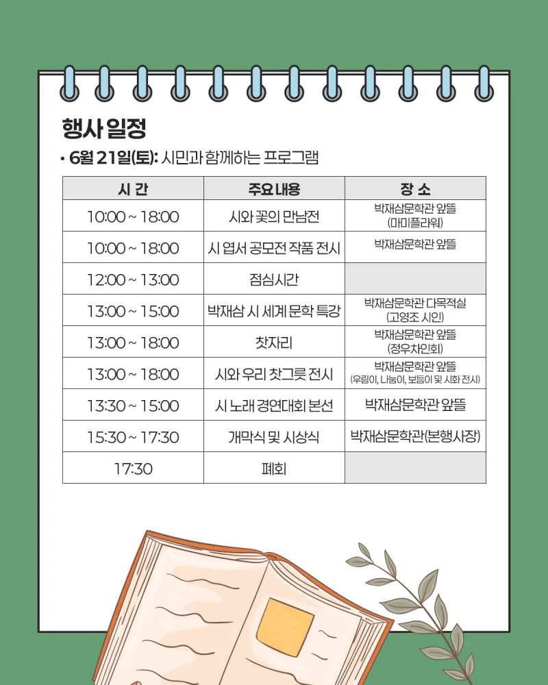 내 용: 박재삼 시 백일장, 시 엽서 공모전, 시 창작 노래 경연대회, 문학 특강 및 전시 행사 등