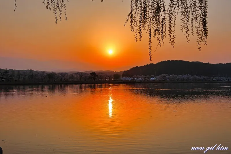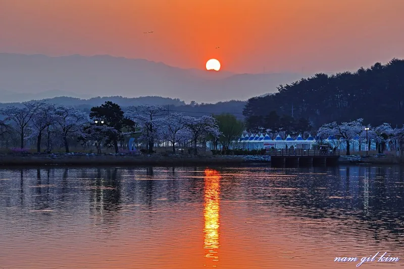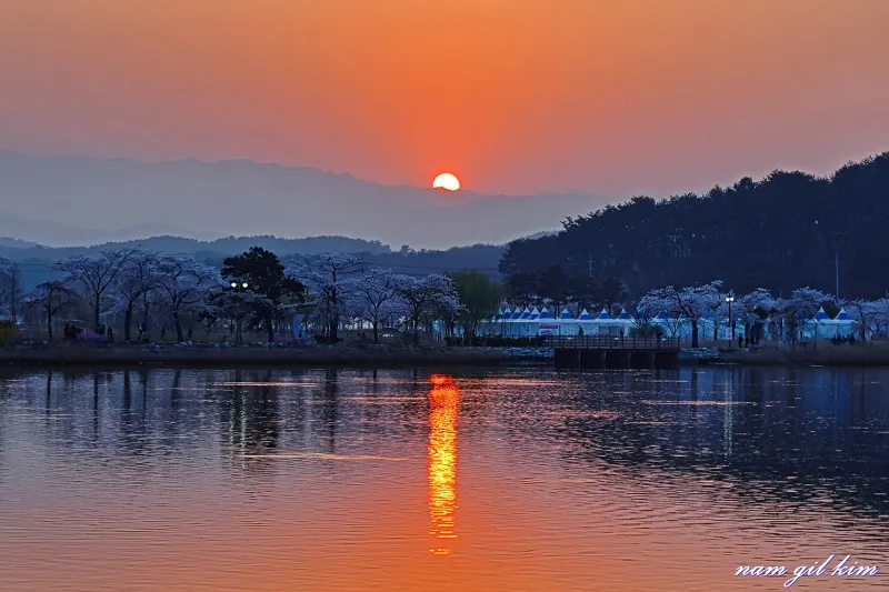 경포 벚꽃축제 개막 첫날인 3월 31일 오후에 축제장을 둘러보고 야경을 촬영하기 위해 경포대 맞은편 경포호수에서 해가 지길 기다리며 멋진 해넘이 풍경도 촬영했습니다.